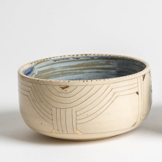 these handmade bowls are each hand made individually, and designed with an abstract circle design, inspired by continuity. each bowl is finished with gold accents blended into the design. these bowls can be ordered individually or as part of a set. this extra special size fits a regular "salatim" container perfectly, and will allow you to hide the plastic salatim container in the bowls, that way you can serve them in these contemporary elegant bowls directly on the table, with no mess at all!