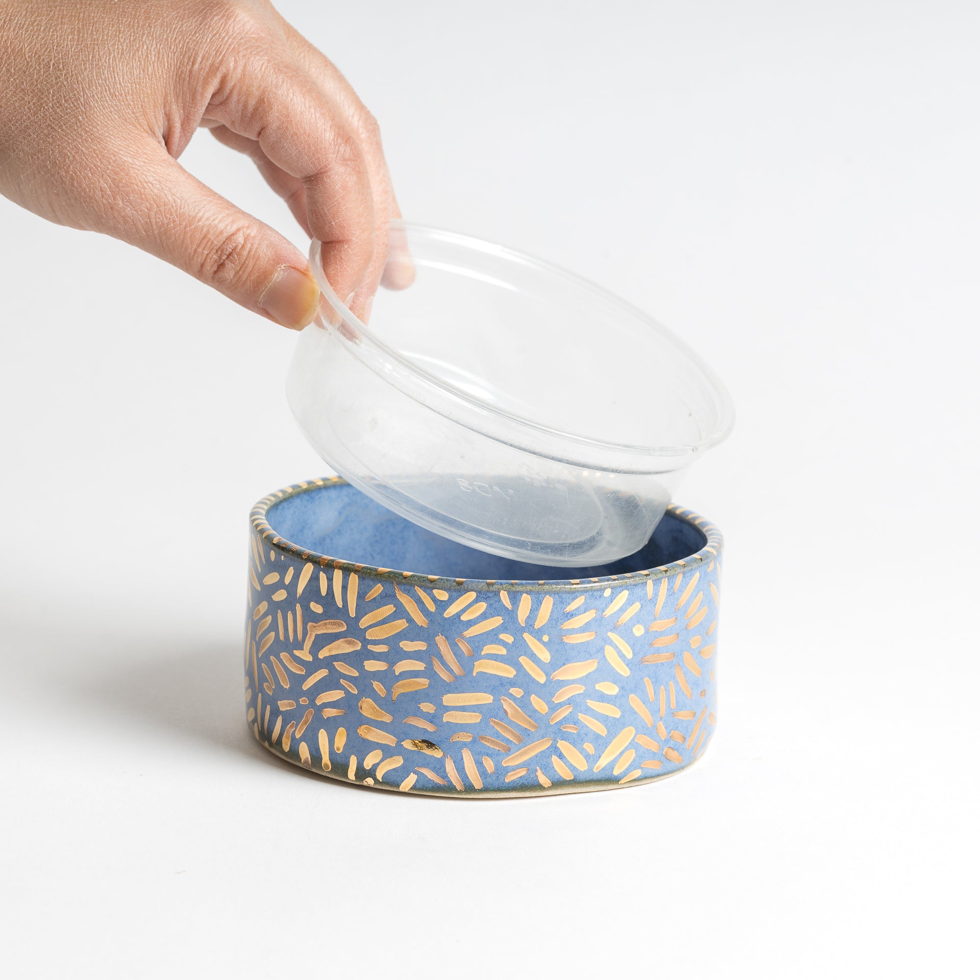 this handmade bowl is glazed in a rich blue glaze and designed with a tiny gold leaf design. this dish can be ordered individually or as part of a set. this extra special size fits a regular "salatim" container perfectly, and will allow you to hide the plastic salatim container in the bowls, that way you can serve them in these contemporary elegant bowls directly on the table, with no mess at all!