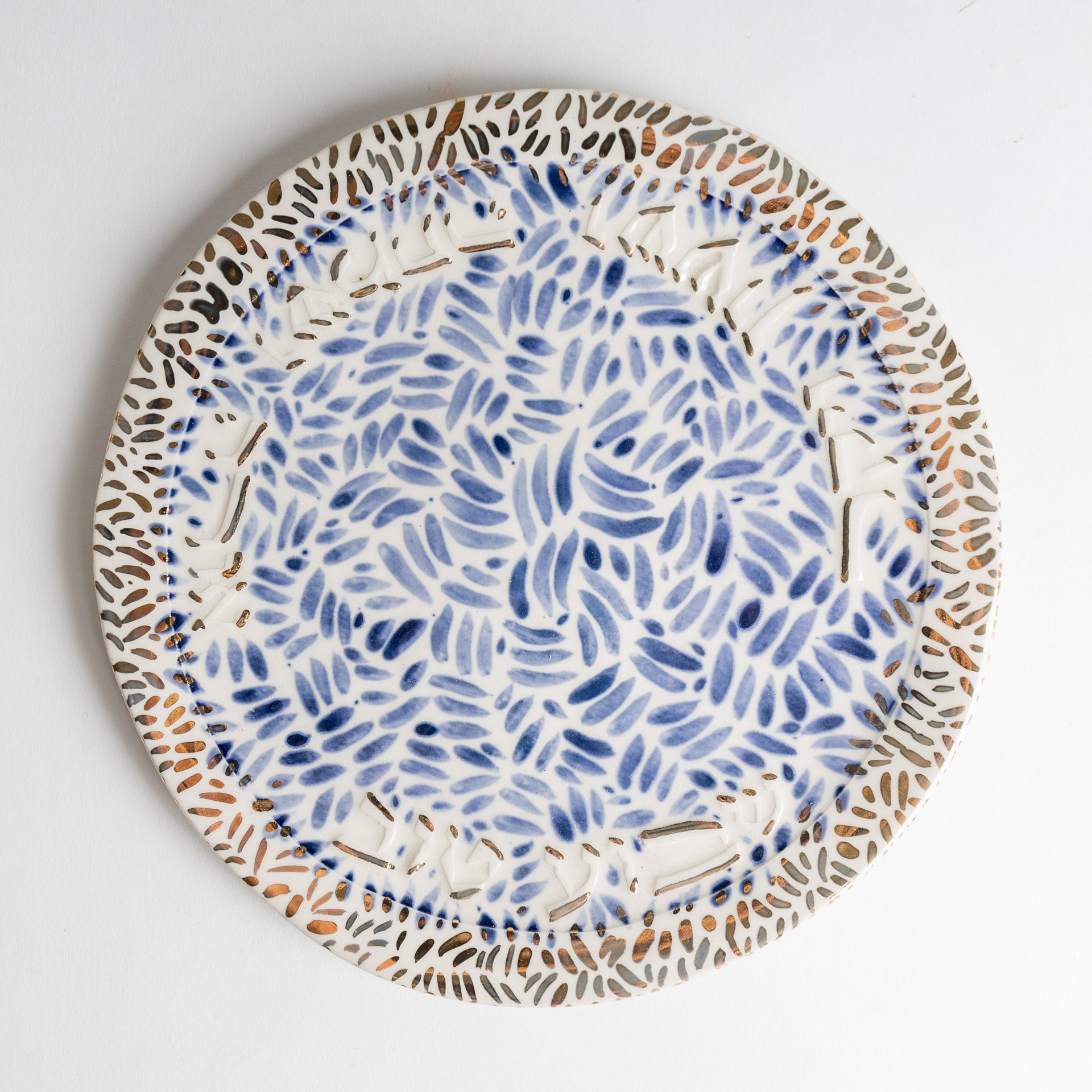 elegant medium size kiddush cup handmade with stained blue clay and hand painted with green leaves and gold luster accent. can be ordered individually or as part of a havdallah set.
