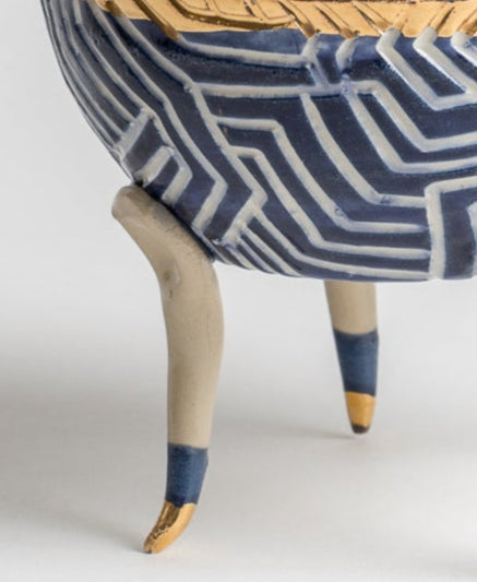 handmade ceramic candy dish with blue and white robot-like design, elevated on 4 delicate ceramic legs with wearing blue and gold socks.