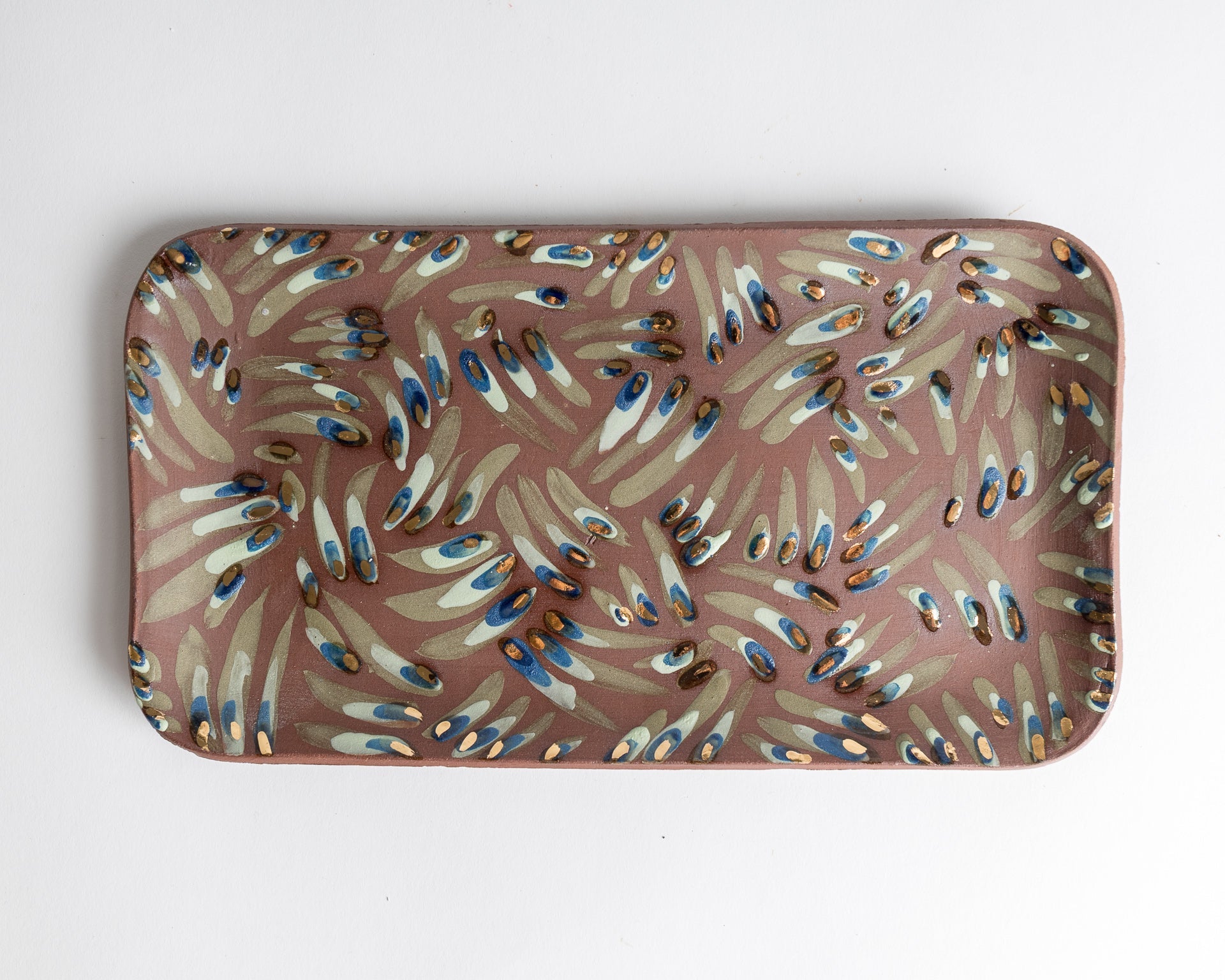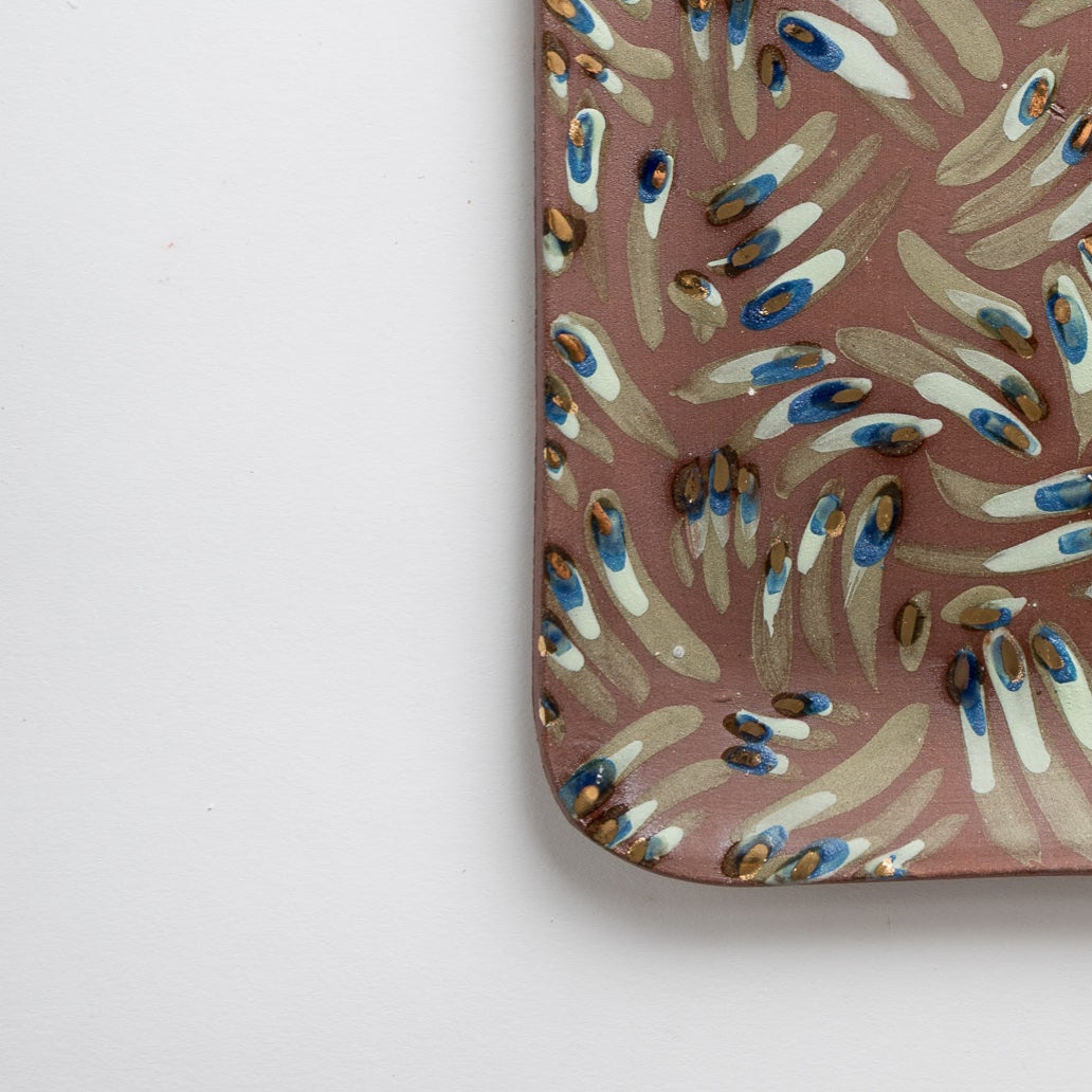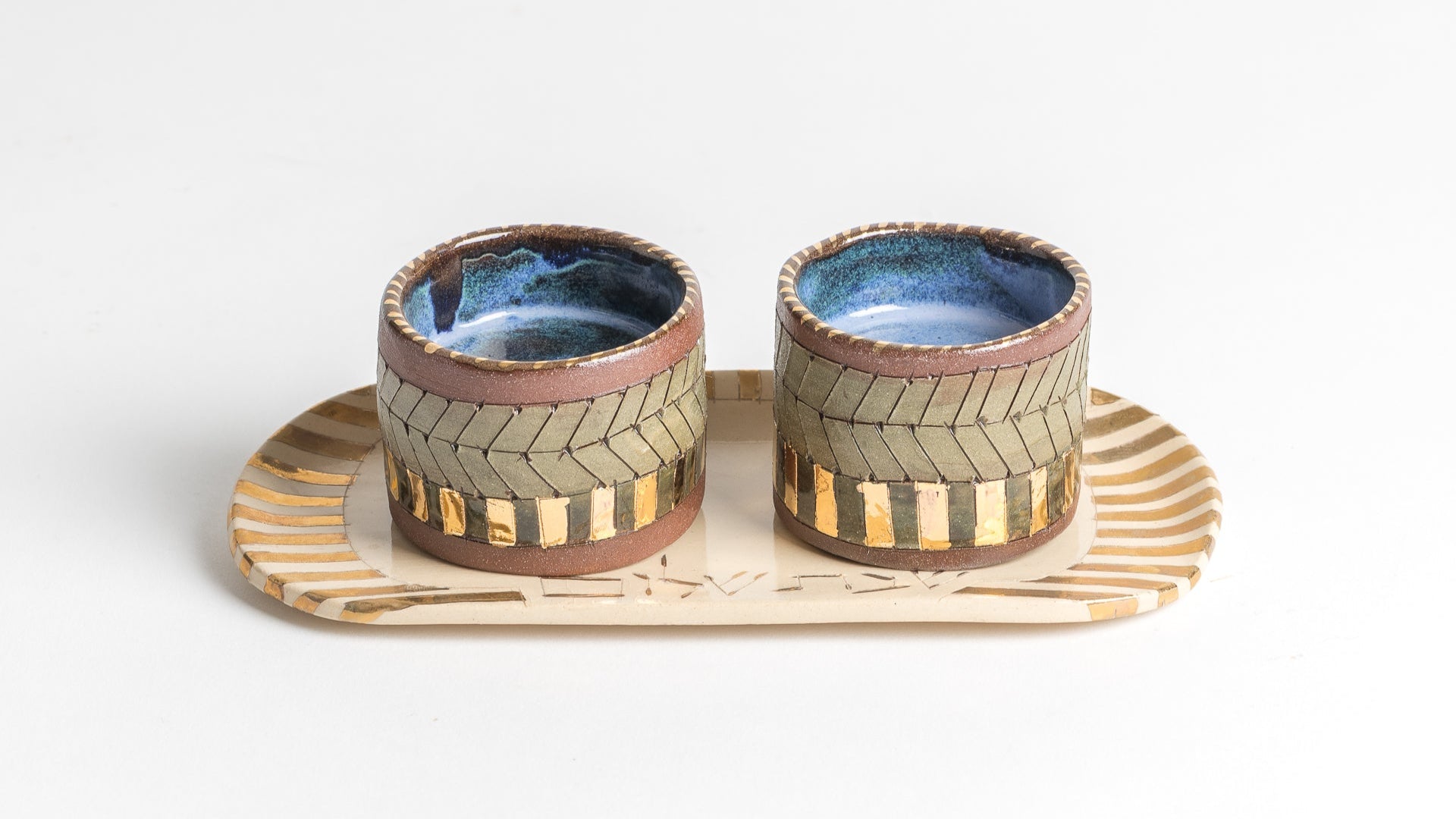 in this luxurious havdallah set, the terra cotta clay normally used for sculpting figures is used in a refined and elegant way, to enhance the practice of this bittersweet spiritual ceremony. each piece of the set has been hand painted with green engobe, hand carved with lines to create the herringbone design, and finally painted with rich gold lining to accent the curves of each piece. The "peacock" design dish serves as a colorful canvas for the 3 pieces- all integral parts of this sacred and powerful ceremony. the wine we drink, the spices we smell, the fire we see and feel the warmth of, each part sending us off into the new week ahead untill we can welcome shabbat once more.