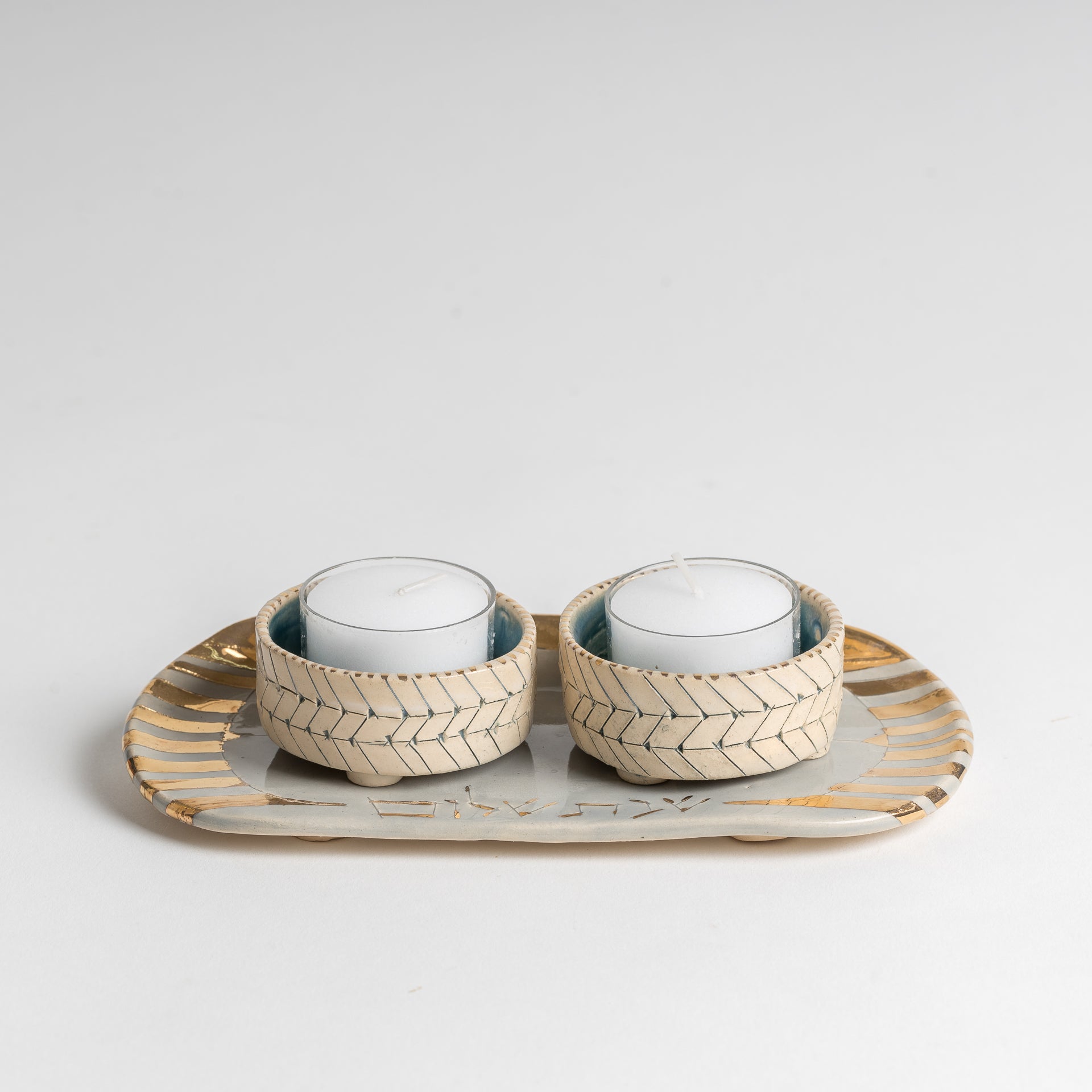 Shabbat candle holder blends tradition with contemporary design. Made from natural clay and finished with elegant gold touches, it brings warmth and beauty to your Shabbat blessing ceremony.