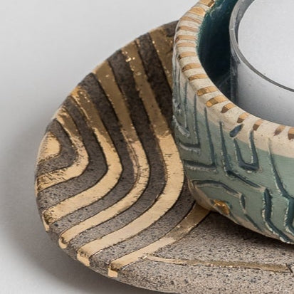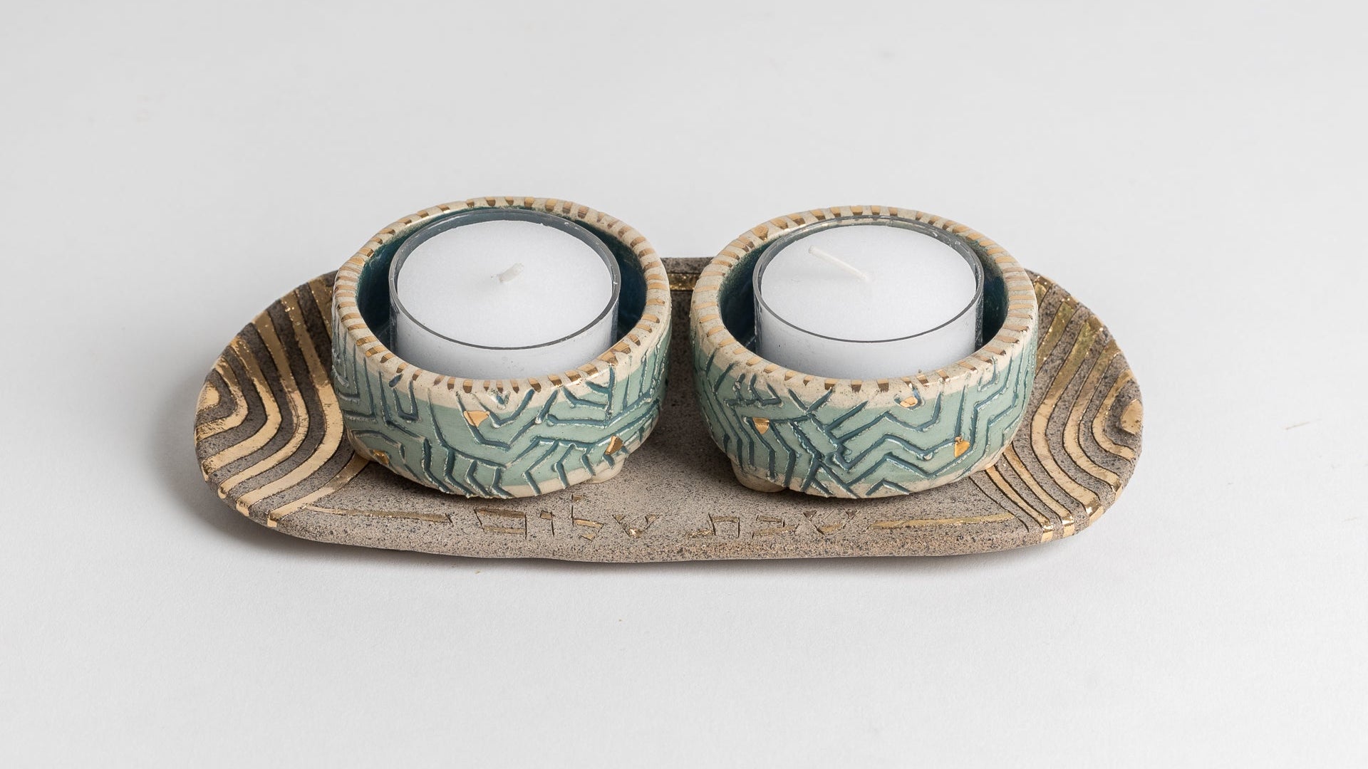 these lovely compact candlesticks are great for home and travel, and come with an elegant hand painted dish in grey clay. the geometric design gives a funky modern twist to the age old candle lighting ceremony. perfect for tea light candles, these modern candle holders, will sit lovely as a statement piece all week and allow you to begin your shabbat in style!