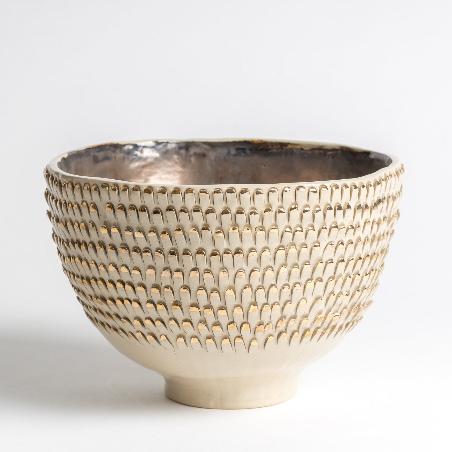 this large vessel will make a statement piece for your home or any important space. the bowl shape is glazed gold on the inside, and left the shiny natural stoneware color on the outside, upon which i have created the spiky gold design. each spike is pulled individually to create a strong vibrant texture that leaves you guessing on the materials and execution of the piece. perfect for a special niche in your home, hallway, display shelf, or table.